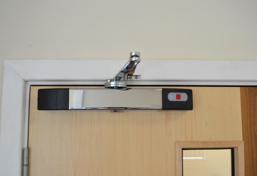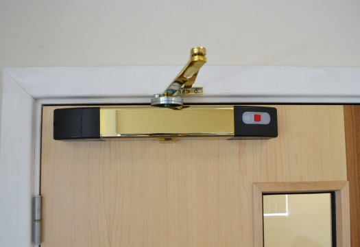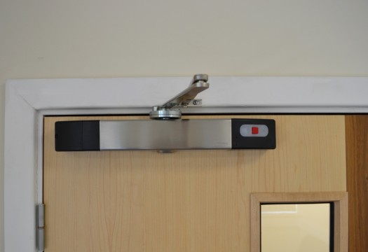 The closer is battery-powered and features an LED display screen to make maintenance easy. The screen will display a low battery warning and can also be used to set up a daily timed release to make sure all fire doors are closed at night. The closer will not hold the door if the batteries run out of power.