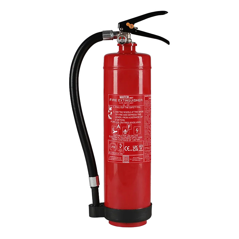 The revolutionary new Watermist Extinguishers are designed to combat Class A, F, and electrically started fires. Specially designed rotors in the extinguisher mix water and air in a pre-set proportion to generate a fine mist of 40–60-micron molecules. These tiny droplets have a surface area coverage many times higher than water. The mist is then propelled through a specially designed nozzle, giving it a large throw.