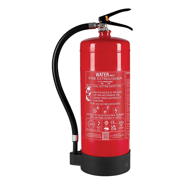 The revolutionary new Watermist Extinguishers are designed to combat Class A, F, and electrically started fires. Specially designed rotors in the extinguisher mix water and air in a pre-set proportion to generate a fine mist of 40–60-micron molecules. These tiny droplets have a surface area coverage many times higher than water. The mist is then propelled through a specially designed nozzle, giving it a large throw.