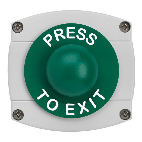 The CQR Momentary “PRESS TO EXIT” Green Dome Button is a high-quality exit button suitable for external egress applications, featuring robust construction and various color options.