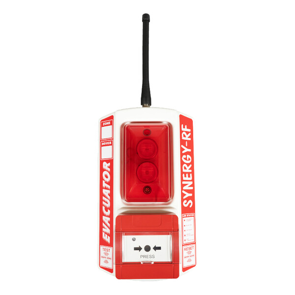 The Evacuator Synergy-RF call point site alarm is designed for use as part of an addressable alarm system containing other Synergy RF devices. The sounder/strobe unit has built-in radio frequency technology, allowing up to 40 site alarms to be wirelessly interlinked. Upon system activation, the sounder/strobe emits a 110dB alarm and provides visual warning from its Bright LED strobe. When interlinked, the Synergy RF base station or call point (both sold separately) can be used to test or reset the wireless system from a single location.