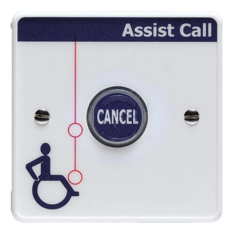Ancillary cancel plates are commonly installed on the opposite side of a bed in accessible bedrooms, providing cancel functionality for users who may transfer to either side. They should be mounted between 800mm to 1000mm from floor level. In accessible toilets, they should be placed above the handrail.