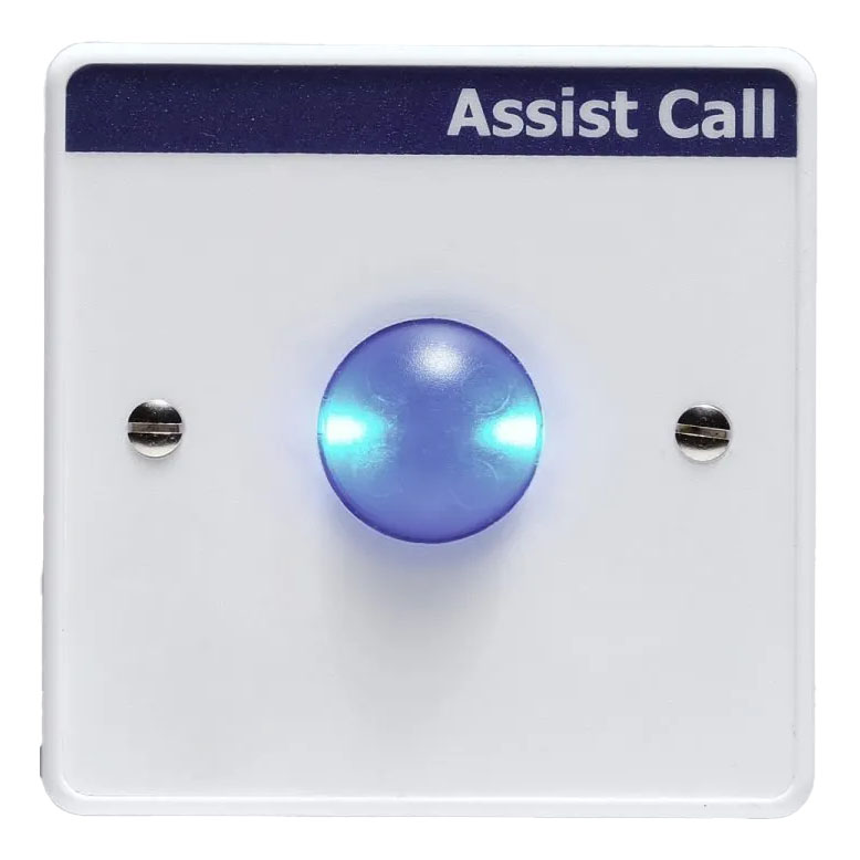 When the alarm is activated, the over door indicator will flash blue and play an alarm tone. Once the alarm is acknowledged by pressing a cancel button, the indication changes to solid blue and the sounder emits a pair of beeps every 15 seconds to confirm help is on the way.