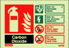 Photoluminescent extinguisher ID sign for CO2 fire extinguishers which is available in 3 sizes and finished on rigid PVC plastic.