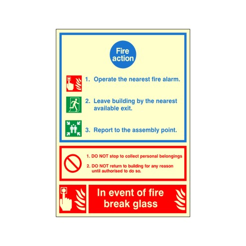 This Photoluminescent Fire Action Sign offers clear indication of the actions to take in the event of a fire and is available in rigid plastic or self adhesive.
