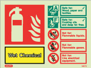 Photoluminescent extinguisher ID sign for wet chemical fire extinguishers which is available in 3 sizes and finished on rigid PVC plastic.
