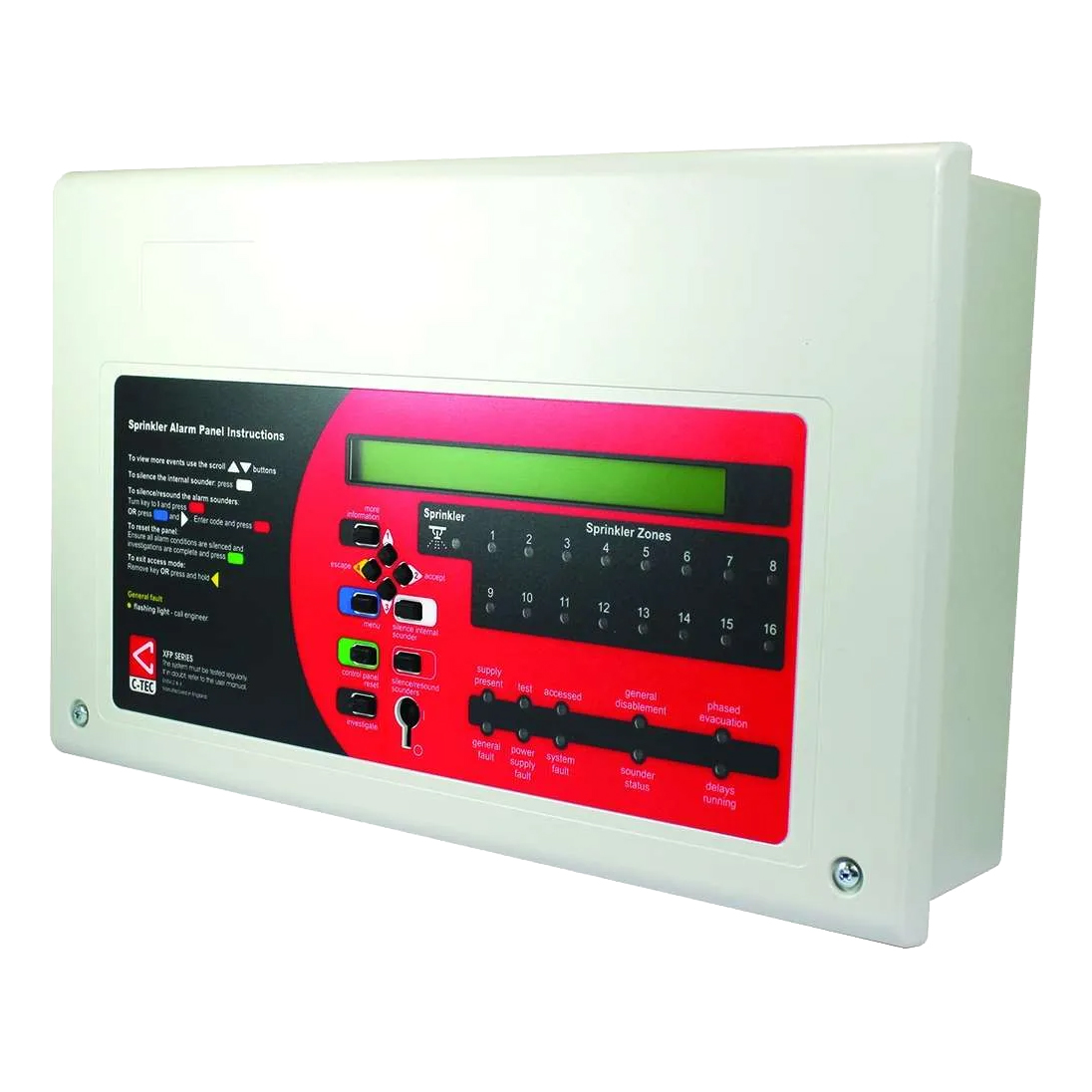 The C-TEC SAP501E/CA is a sophisticated 1 Loop 16 Zone Addressable Sprinkler Monitoring Panel designed for effective monitoring of up to 255 sprinkler flow switches. Utilizing the advanced technology found in C-TEC’s XFP addressable fire panel, this unit offers reliable performance and flexibility. It features up to 16 assignable sprinkler zone indicators, which can be configured using the panel’s PC programming tools, making it an ideal solution for various applications.