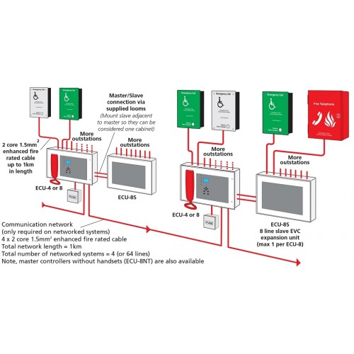 The SigTEL 8 Line Master Controller, part number ECU-8NT, is an ideal solution for disabled refuge, fire telephone, and stadium marshalling applications. Designed for networked SigTEL systems that do not require multiple control points, this unit does not include a handset. It can connect to up to eight disabled refuge or fire telephone outstations, with improved networking capabilities allowing systems of up to 224 lines with optional desk unit control.
