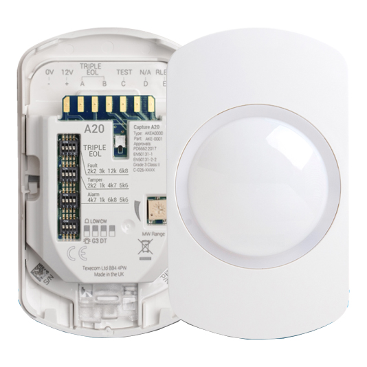 The Capture A20 is a Grade 3 wired wall mount detector featuring 20m dual technology quad PIR and K-band microwave sensing, combined with active-IR anti-masking protection.