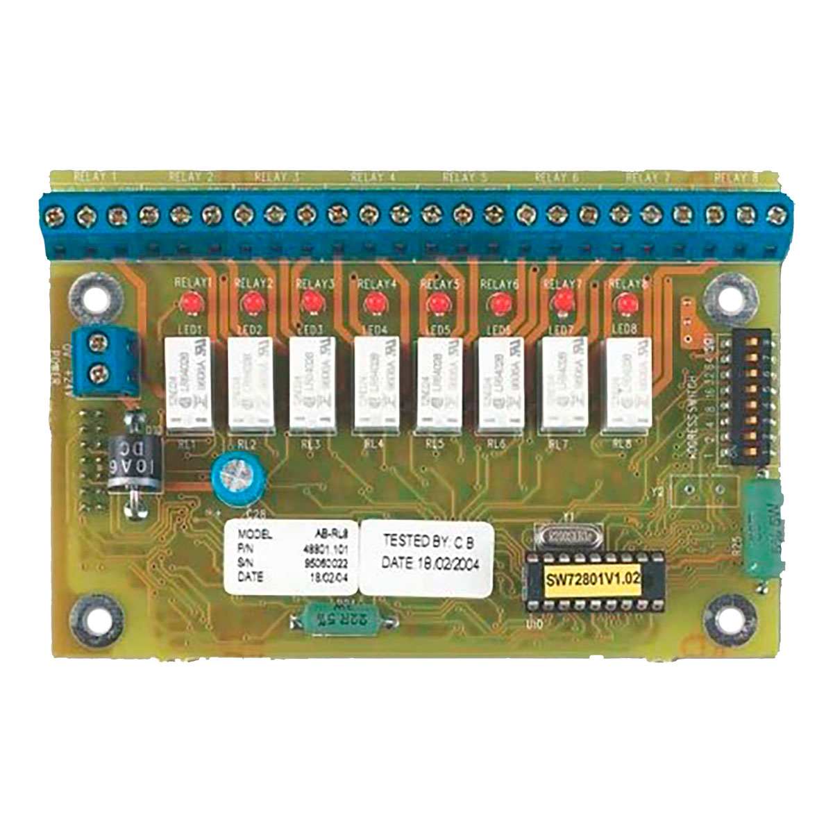 The ZP3AB-RL8 is a relay board designed to extend the ZP3 panel’s standard range of input/output facilities. It offers eight programmable relay outputs and is part of a series of auxiliary boards that can be mounted inside the ZP3 panel enclosure using a ZP3-AC1 auxiliary chassis. Up to three boards can be fitted into a ZP3 panel, allowing for a maximum of 72 outputs within the enclosure. Additional boards can be added in a remote control cabinet, enabling the operation of up to 896 outputs, with 768 being programmable.